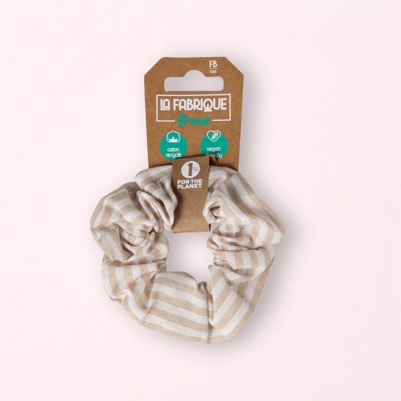 Ce chouchou grand modèle est fabriqué à partir de tissu de coton recyclé.
